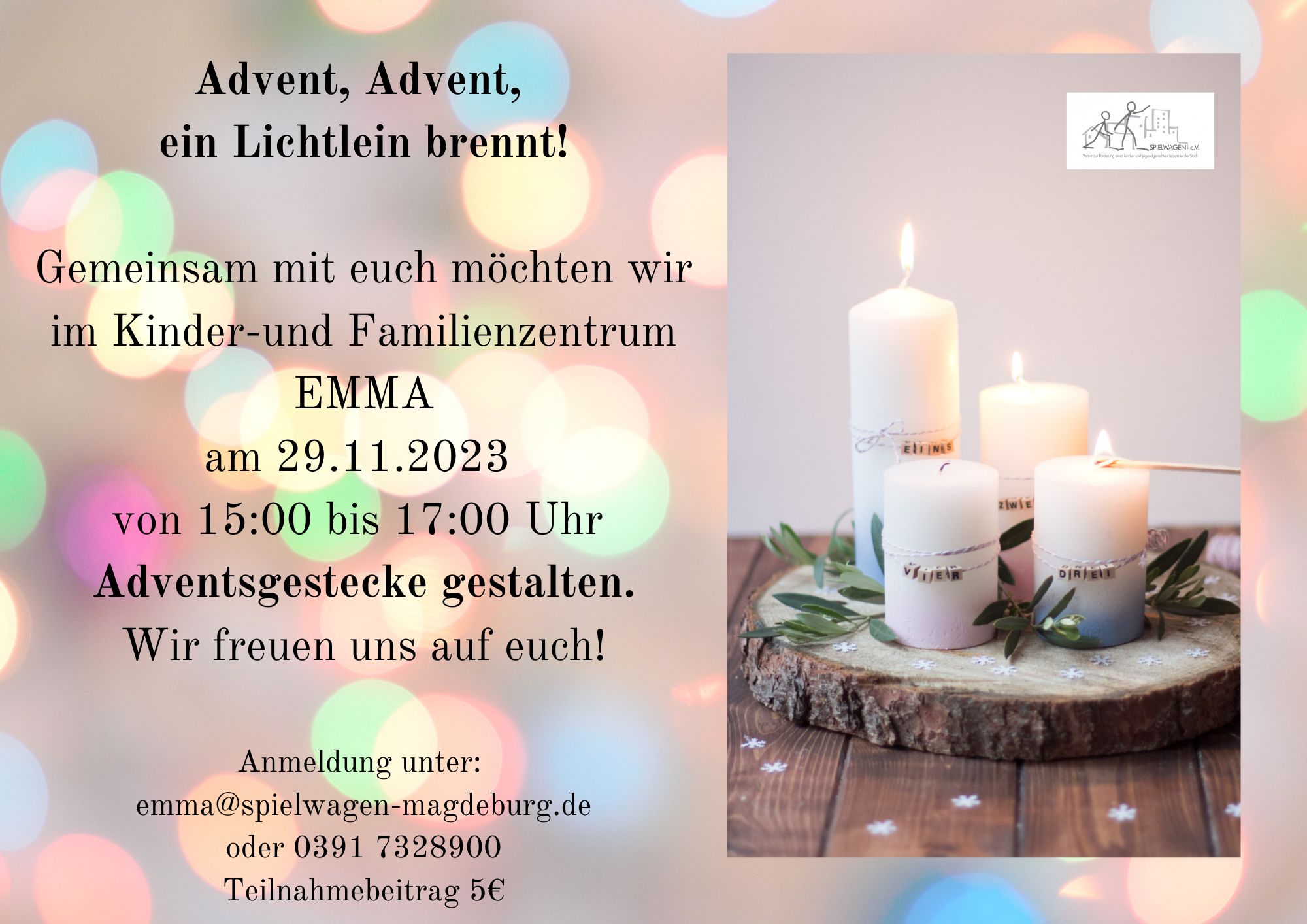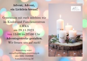 Am 29.11.2023 wird es in der Zeit von 15:00-17:00 Uhr im Kinder-& Familienzentrum EMMA weihnachtlich. Kurz vor dem ersten Advent wollen wir gemeinsam mit Familien Adventsgestecke der anderen Art gestalten. Baumscheiben, Grünschnitt und allerlei Weihnachtsdeko kann kreativ verwendet werden, um sein individuelles Adventsgesteck zu gestalten. Alle Interessierten melden sich bitte vorab in der EMMA unter emma@spielwagen-magdeburg.de oder unter der Telefonnummer 0391/7328900 an. Für die Teilnahme ist ein Beitrag von von 5,-€ erforderlich. Liebe Grüße, das EMMA Team