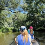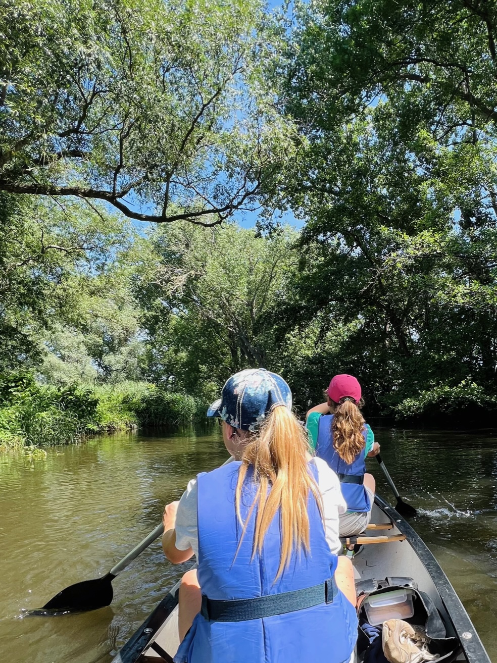 Mit dem Schienenersatzverkehr und anschließend mit dem Zug ging es in Richtung Vorharz nach Wegeleben. Dort angekommen konnten wir nach ein paar Kilometern zu Fuß endlich in die Kanus steigen und auf der traumhaften Bode nach Gröningen paddeln. Entlang der Bode gab es für die jeweils acht Schüler*innen der Evangelischen Sekundarschule Magdeburg an drei unabhängigen Kanutagen allerhand zu sehen und zu erleben: Eisvögel und Entenfamilien kreuzten unseren Weg, Pferde und Kühe mit kleinen Kälbern grüßten uns vom Ufer aus und unzählige Libellen begleiteten uns ein Stück auf unserer Route. An fast jeder schattigen Sandbank oder Insel machten wir Rast und tobten im kühlen Nass der Bode und konnten auch kleine türkisblaue Schätze (Bode-Achat) finden. Wir passierten kleine Orte, bezwangen Stromschnellen, die uns ordentlich beschleunigten, und paddelten unter mehreren Brücken hindurch entlang der traumhaft bewachsenen Uferböschungen zum idyllisch gelegenen Bootsverleih und Campingplatz in Gröningen. Auf dem Weg zum Bus gönnten wir uns noch ein leckeres Eis, um dann voll bepackt mit tollen Erinnerungen und geschafft vom Tag zurück nach Magdeburg zu fahren.