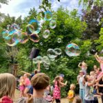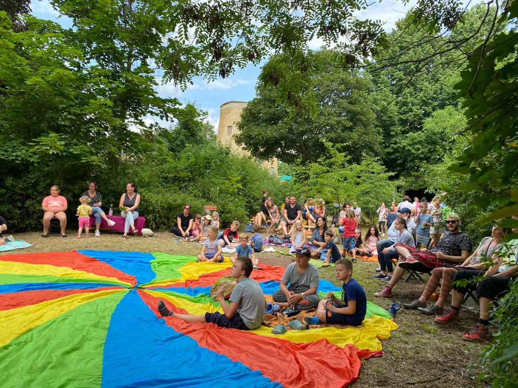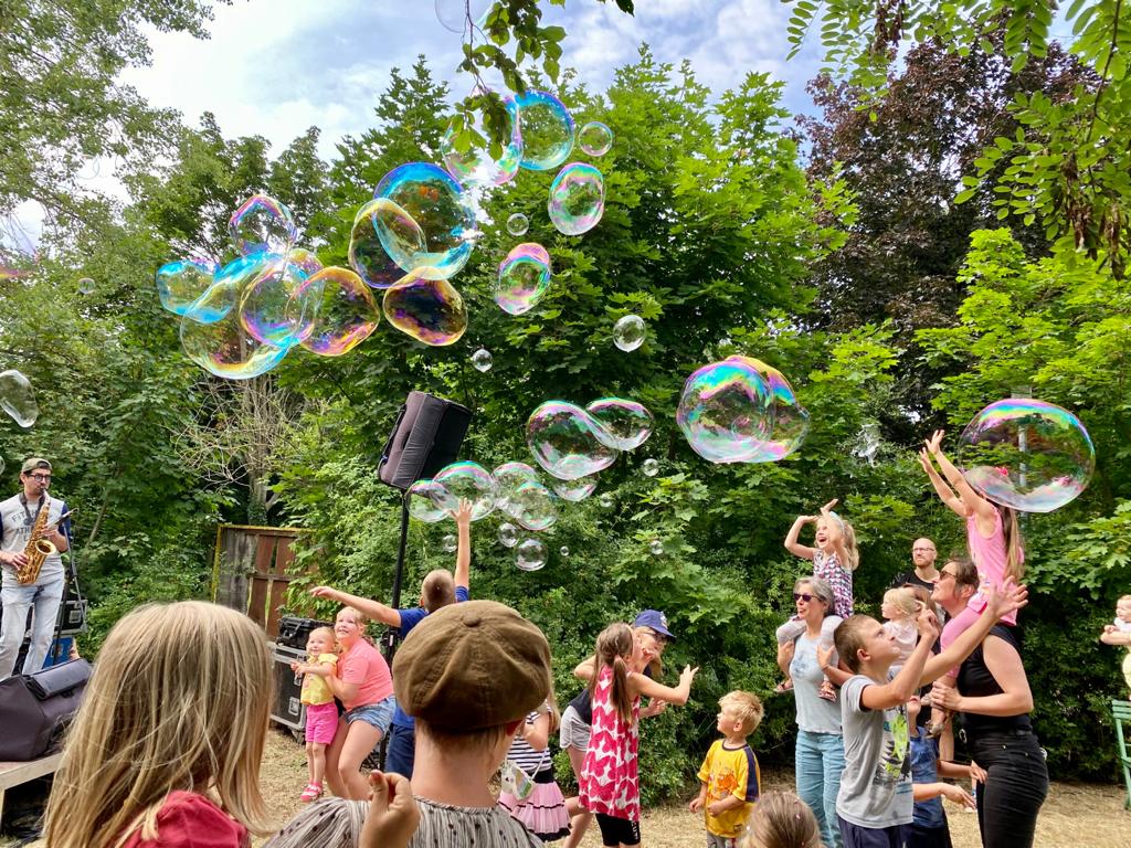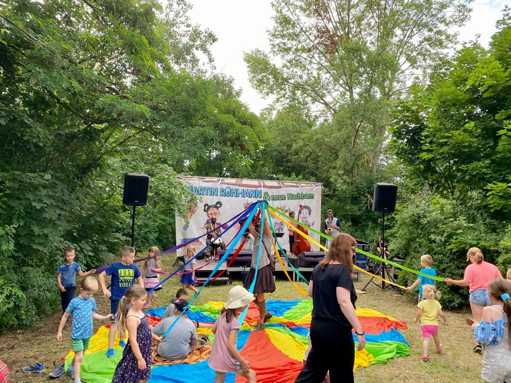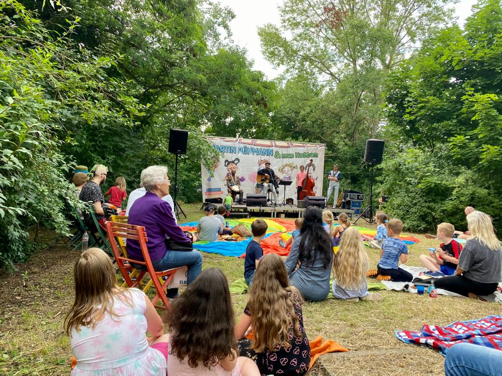 … mit diesem beschwingten Ohrwurm verabschiedeten Martin Rühmann & neue Nachbarn die zahlreichen kleinen und großen Gäste in den Samstagabend. Es war ein zauberhaftes Konzert im Grünen auf dem Gelände des Spielwagen e.V. in Neu-Olvenstedt. Wir blicken auf einen rundum gelungenen Nachmittag mit Musik zum Mitsingen & Mitmachen, jeder Menge Quatsch, riesigen Seifenblasen und überhaupt auf eine tolle Atmosphäre zurück. Chapeau! und DANKE an das Team des Kinder- & Jugendtreff MÜHLE für die schweißtreibende Vorbereitung des Geländes und für das Engagement in ihrem „Kietz“. Herzlichen Dank auch an Martin und sein Team für die tollen 2 Konzerte mit uns und die wundervolle Zusammenarbeit. Fortsetzung folgt – da sind wir uns schon einig.