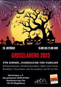 Am 28.10.2023 ist es, bereits zum dritten Mal infolge, soweit. In Kooperation mit jungen, engagierten Menschen und dem Bauspielplatz MÜHLSTEIN findet von 16-21 Uhr der große Gruselabend statt. Der Platz wird sich in Licht und Nebel hüllen, mystische Gestalten werden uns begleiten, für das leibliche Wohl wird gesorgt sein, schöne Kürbisfratzen können geschnitzt werden und natürlich wird das Stockbrot am Lagerfeuer nicht fehlen. DJ Le Fix wird uns zum Tanzen auffordern und unsere Freund*innen der MALABARISTA Feuerjonglagegruppe werden uns die Schönheit der Feuerkunst präsentieren.