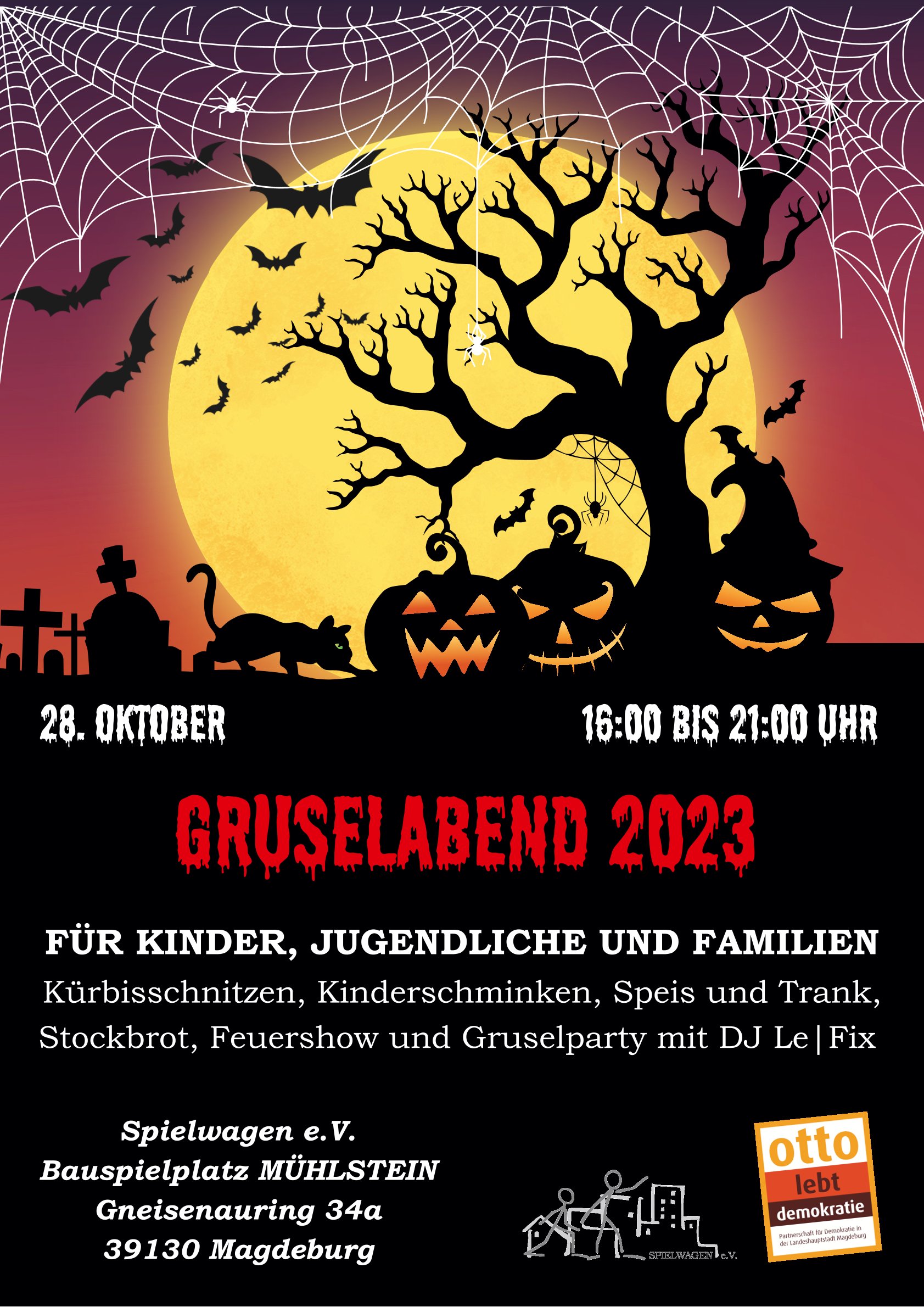 Unterstützt wird unser Fest freundlicherweise vom Beteiligungsfonds der Landeshauptstadt Magdeburg und der GWA Neu Olvenstedt. Zudem durften wir im Fundus der Messe- und Veranstaltungsgesellschaft Magdeburg GmbH (MVGM) stöbern und waren am Ende bis unter´s Bullidach beladen. Herzlichen Dank dafür. Seid gespannt, hübscht euch gern schaurig-schön auf und habt einen feinen Abend mit uns. Wir freuen uns auf euch.
