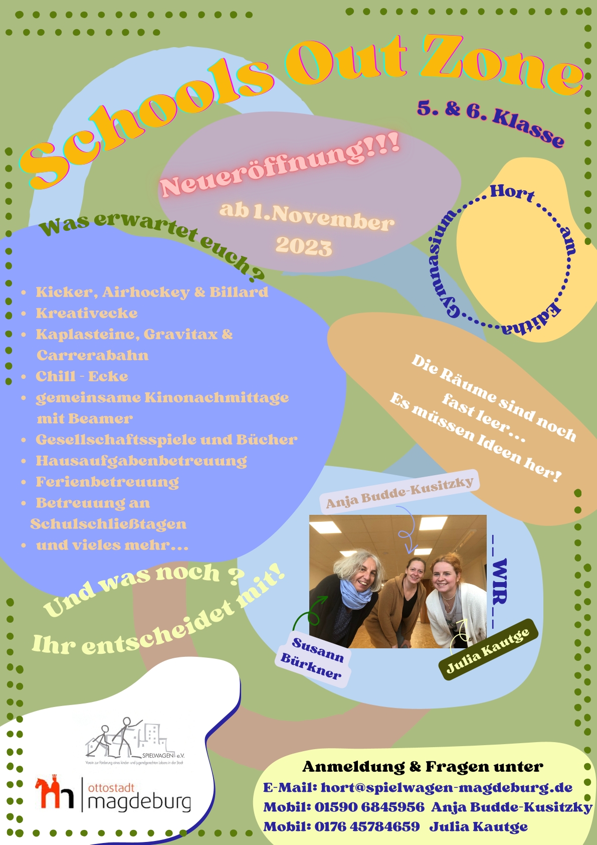 Interessierte Eltern können sich jederzeit mit Fragen an uns wenden. Um den Betreuungsvertrag zu schließen und alle nötigen Unterlagen auszufüllen, vereinbaren Sie gern einen Termin mit uns. Wenden Sie sich dazu per Mail an hort@spielwagen-magdeburg.de. Sollten Sie Fragen haben, dann können Sie sich auch telefonisch an unser Team wenden: 01590 6845956. Unser Hortteam sind Anja Budde-Kusitzky (Leitung), Susann Bürkner und Julia Kautge.