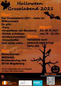 Am 29.10.2021 wird es mystisch auf dem Bauspielplatz MÜHLSTEIN. Von 16-20 Uhr ist ein Gruselabend geplant und wir laden alle Interessierten herzlich dazu ein. Die Idee dazu kam von Colin, einem Schüler der GMS Wilhelm Weitling, dieser wird die Gäste durch den Abend führen und eine Licht- sowie Musikshow bieten. Des Weiteren werden Kürbisse geschnitzt, Stockbrot am Lagerfeuer gebacken, Kinderschminken angeboten und es werden Gruselsnacks bereitstehen. Wir freuen uns auf Euren Besuch, gern auch schaurig-schön verkleidet.