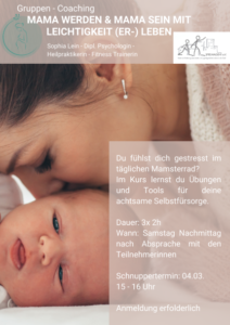 Du fühlst dich gestresst im täglichen Mamsterrad? Dann hat das Kinder-& Familienzentrum EMMA genau das richtige für dich. Am 04.03. startet von 15-16 Uhr eine kleine kostenlose Schnupperstunde, die das Mama sein etwas mehr mit Leichtigkeit erfüllt. Später kannst du in einem Kurs Übungen und Tools für eine achtsame Selbstfürsorge erlernen. Wenn du also Interesse hast daran teilzunehmen, melde dich bitte bei den Mitarbeiter*innen im Kinder-& Familienzentrum EMMA an und informiere dich über das Angebot. Der Kurs wird von Sophia Lein (Psychologin – Heilpraktikerin – Fitness Trainerin) geleitet und durchgeführt.