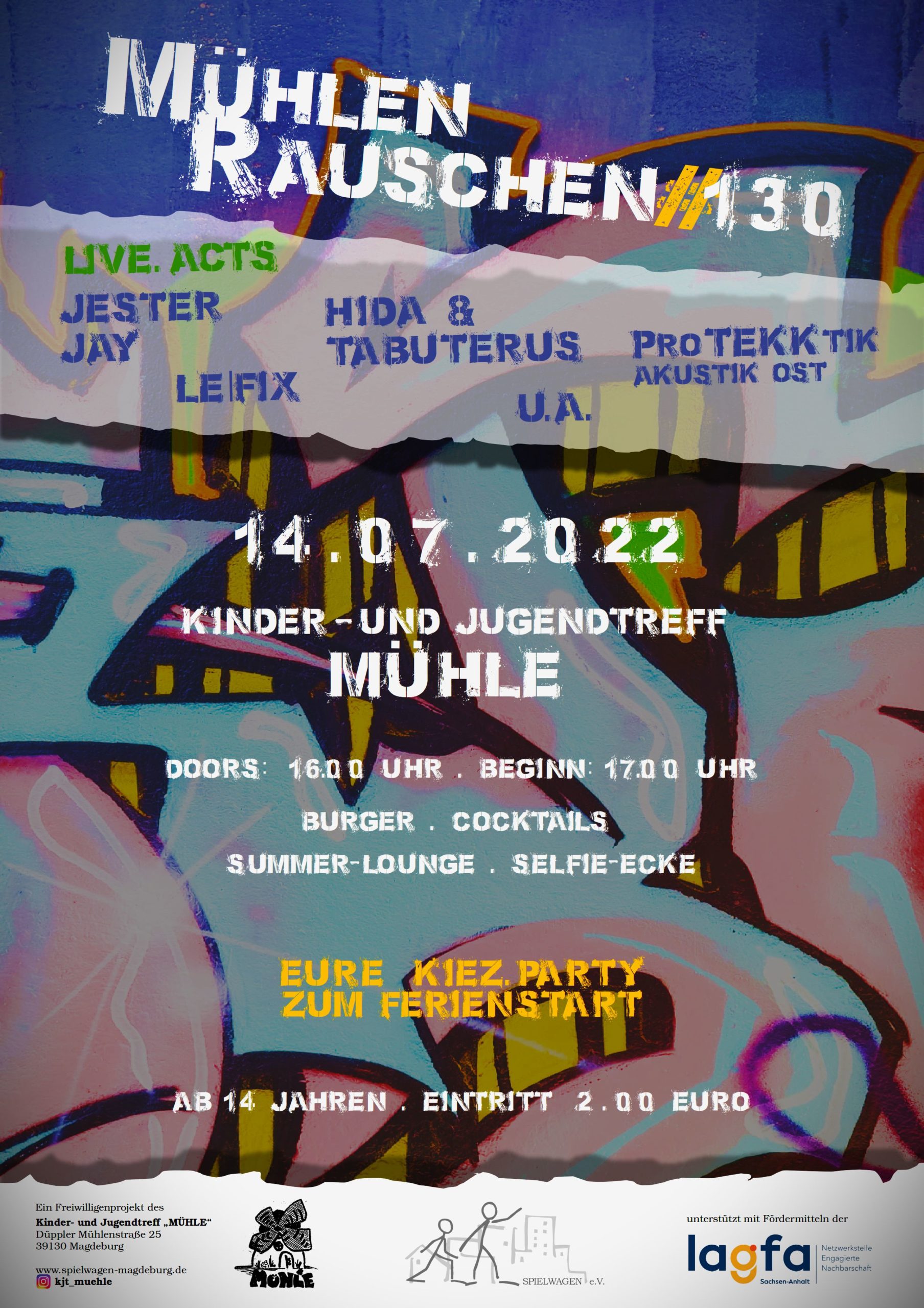 Zum Ferienstart gibt es heute am Kinder- & Jugendtreff MÜHLE, Düppler Mühlenstraße 25, 39130 Magdeburg, ein rauschendes Fest mit tollen Live acts von Jester Jay, Protekktik Akustik Ost, Le Fix, Hida & Tabuterus. Die Türen öffnen um 16:00 Uhr, der Eintritt ist ab 14 Jahren erlaubt und kostet 2,00 €.