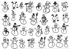 Lust auf ein kleines Rätsel? Was für ein lustiges Schneemanntreffen in der Winterweihnachtswelt! Jeder Schneemann sieht anders aus. Oder? Nein, es sind ja ganz viele Zwillinge dabei! Nur ein Schneemann ist alleine unterwegs. Welcher ist das?